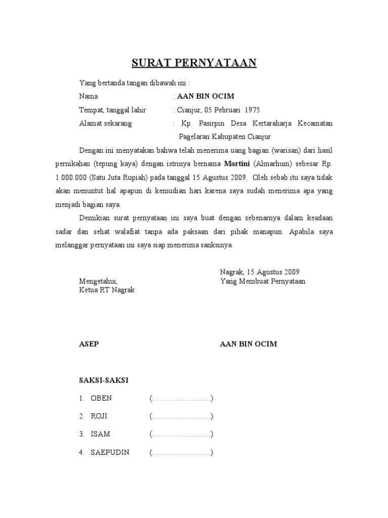 Dengan ini menyatakan bahwa telah menerima uang bagian warisan dari hasil pernikahan tepung kaya dengan istrinya bernama Martini Almarhum sebesar Rp1000000 Satu Juta Rupiah pada tanggal 15 Agustus 2009. Simak contoh surat tersebut dan 8 hal penting yang perlu. Contoh Surat Pernyataan Tanah Hibah Tanah Tanah Wakaf Tanah.